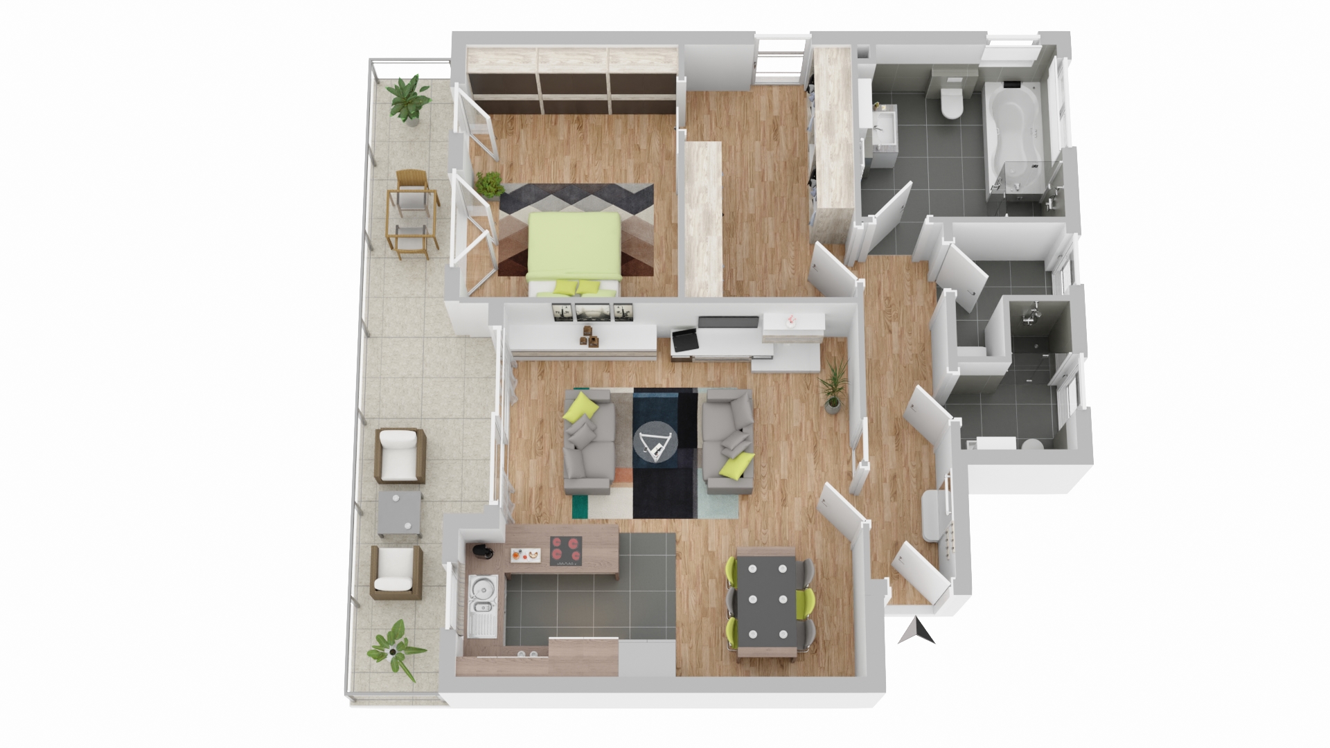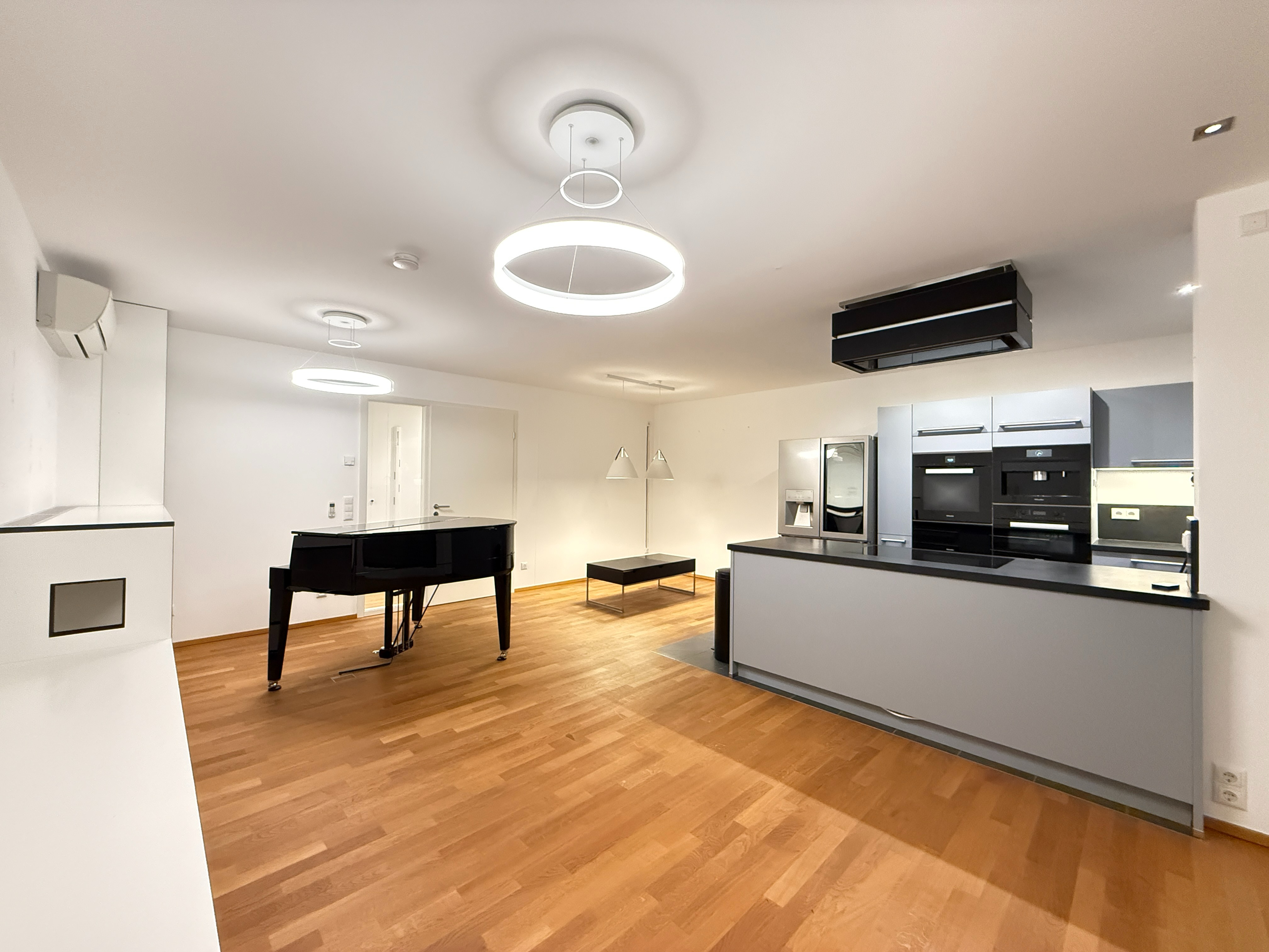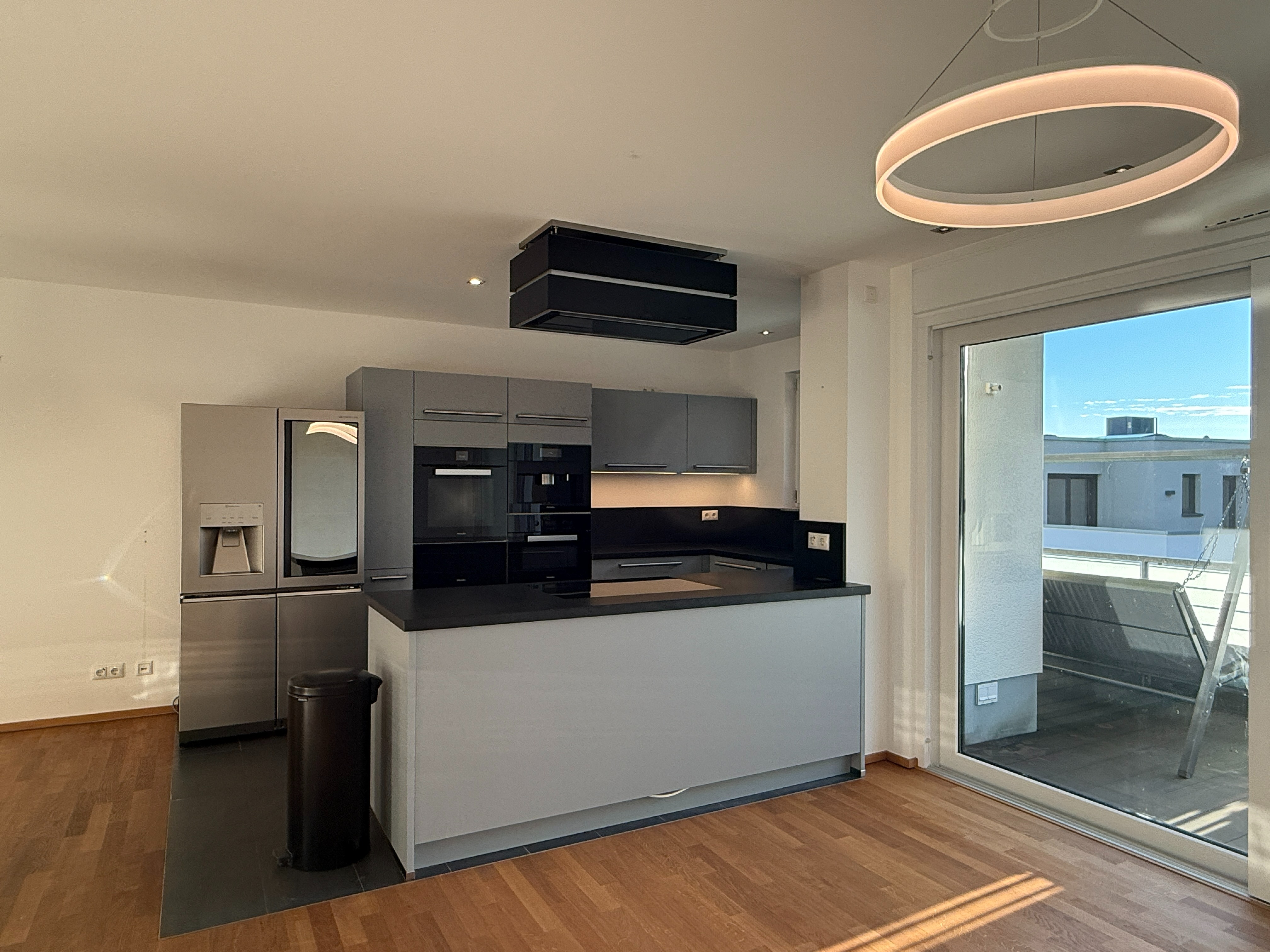 Der großzügige Wohn- und Essbereich überzeugt mit offener Raumgestaltung und einer hochwertigen Einbauküche. Eine große Fensterfront sorgt für viel Tageslicht und führt direkt auf den sonnigen Südwest-Balkon.