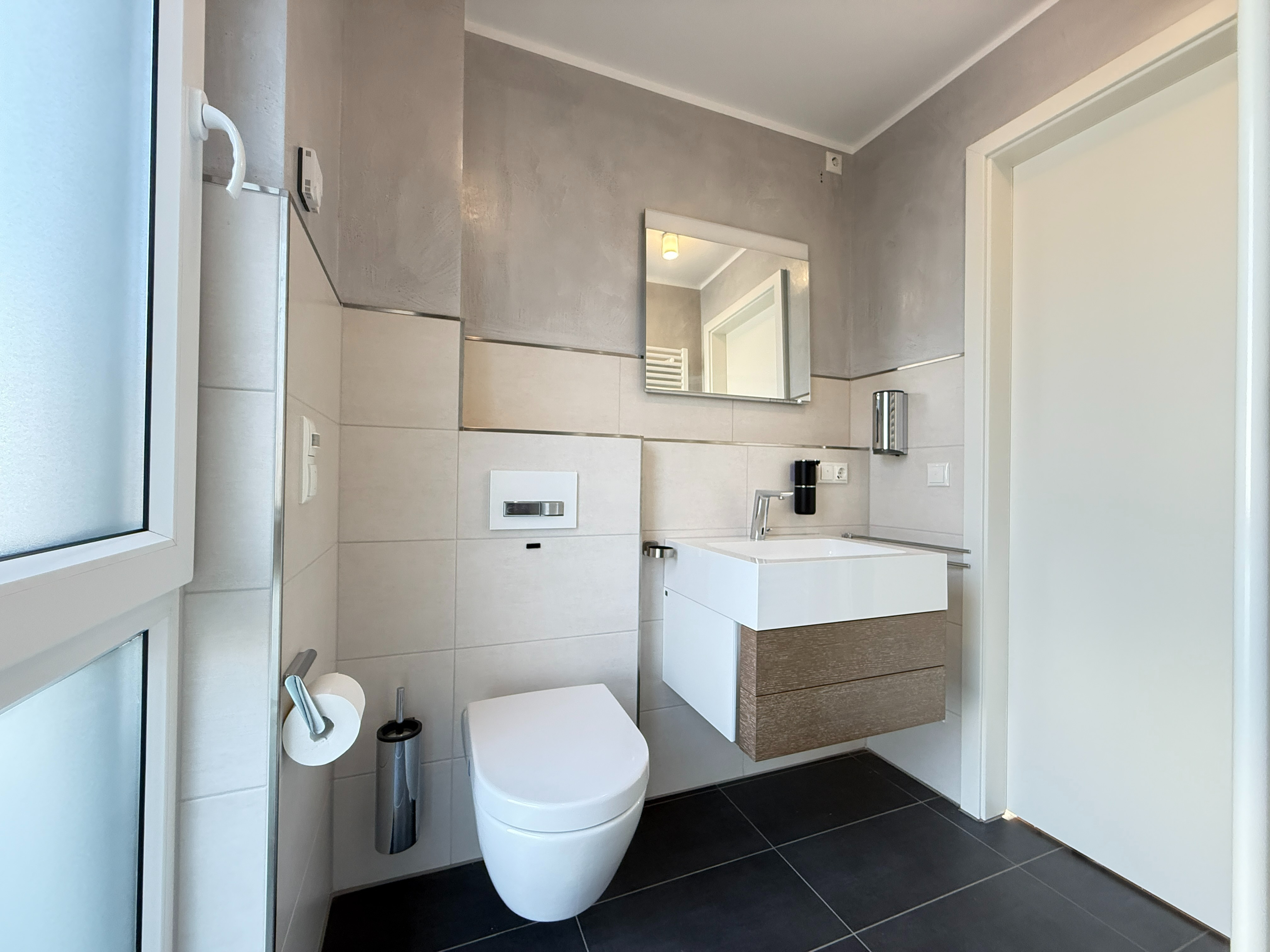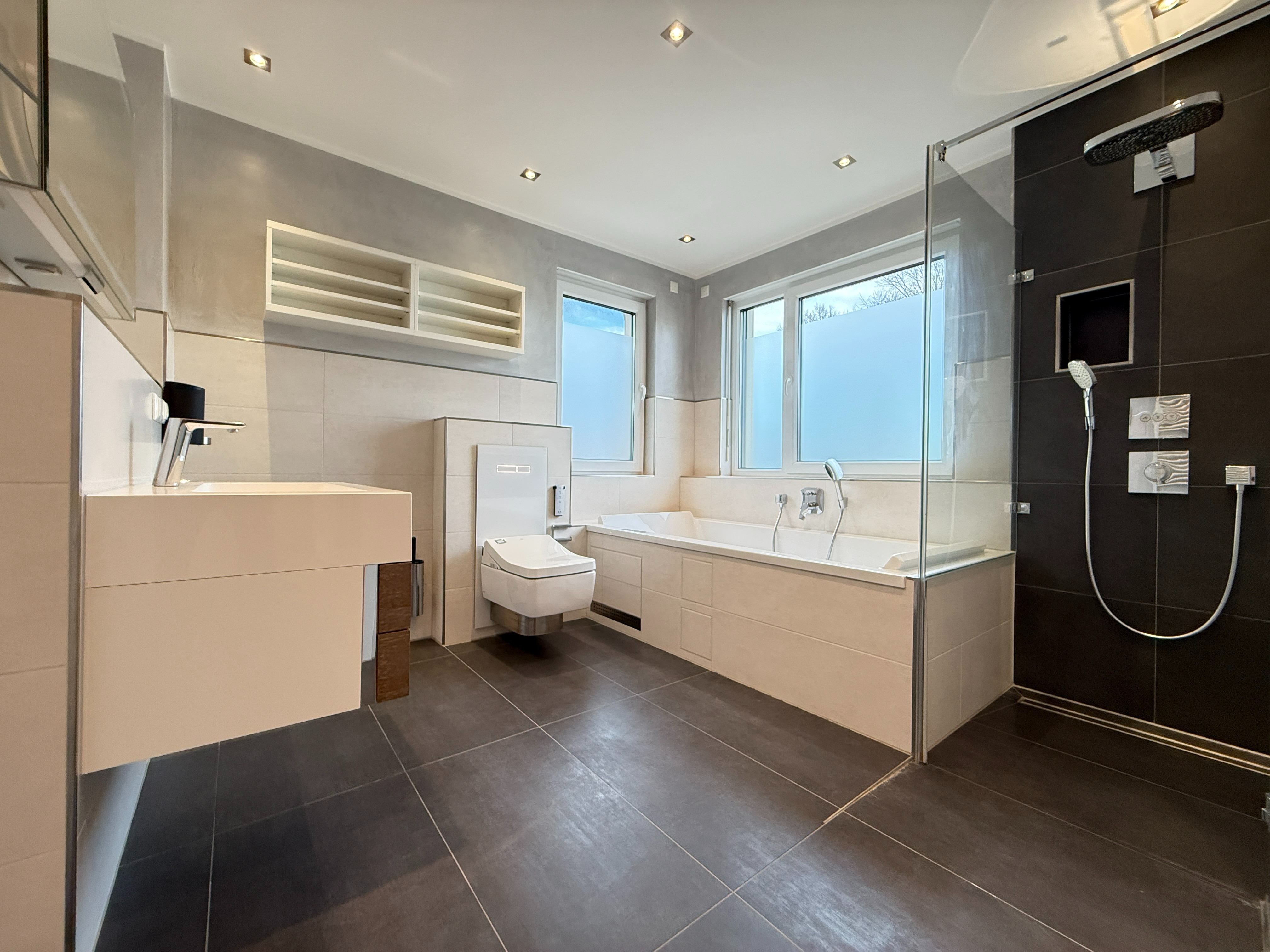 Das geräumige Tageslichtbad sowie ein separates Gäste-WC mit Dusche unterstreichen den hohen Wohnkomfort. Eine gehobene Elektroausstattung inklusive Busch-free@home-System ermöglicht modernes, smartes Wohnen.