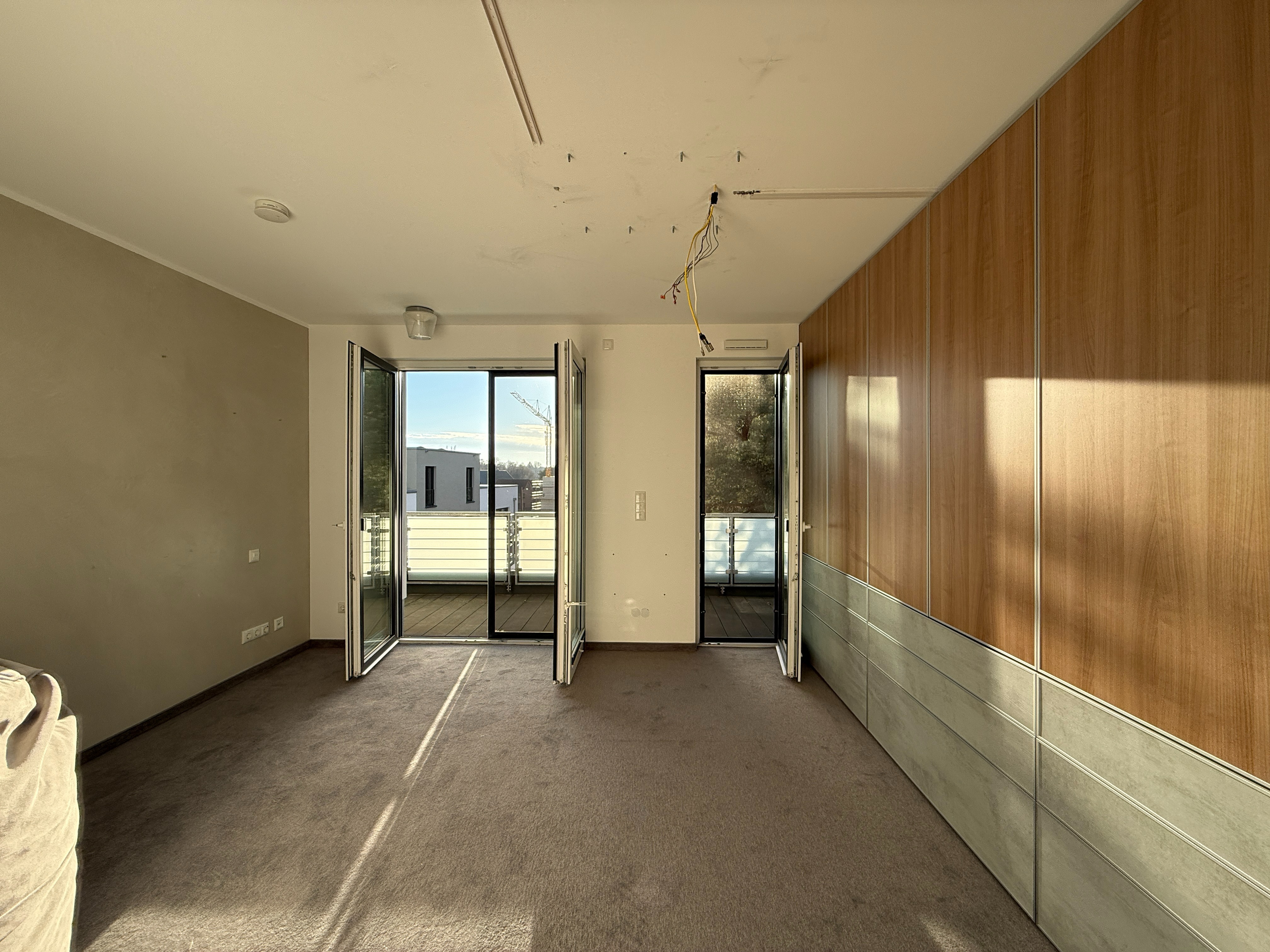Das Schlafzimmer ist mit einem Einbauschrank ausgestattet und verfügt über eine Doppelflügeltür mit Zugang zum Balkon. Ein schallisoliertes Arbeitszimmer bietet ideale Voraussetzungen für Homeoffice.