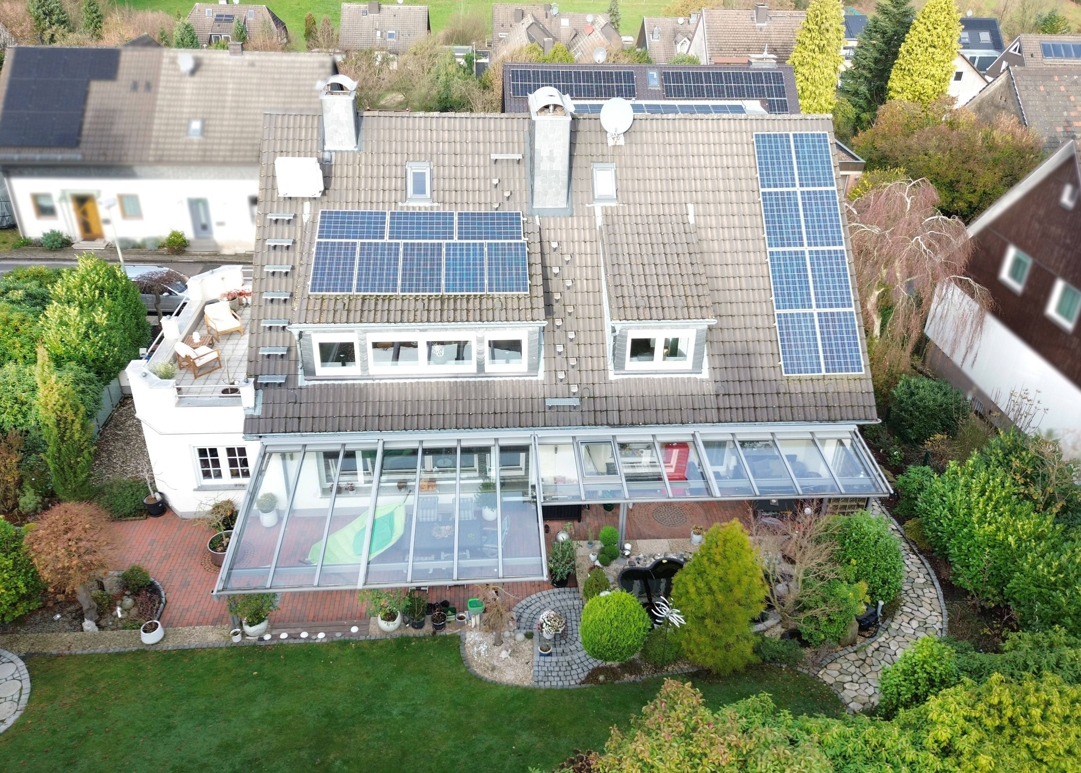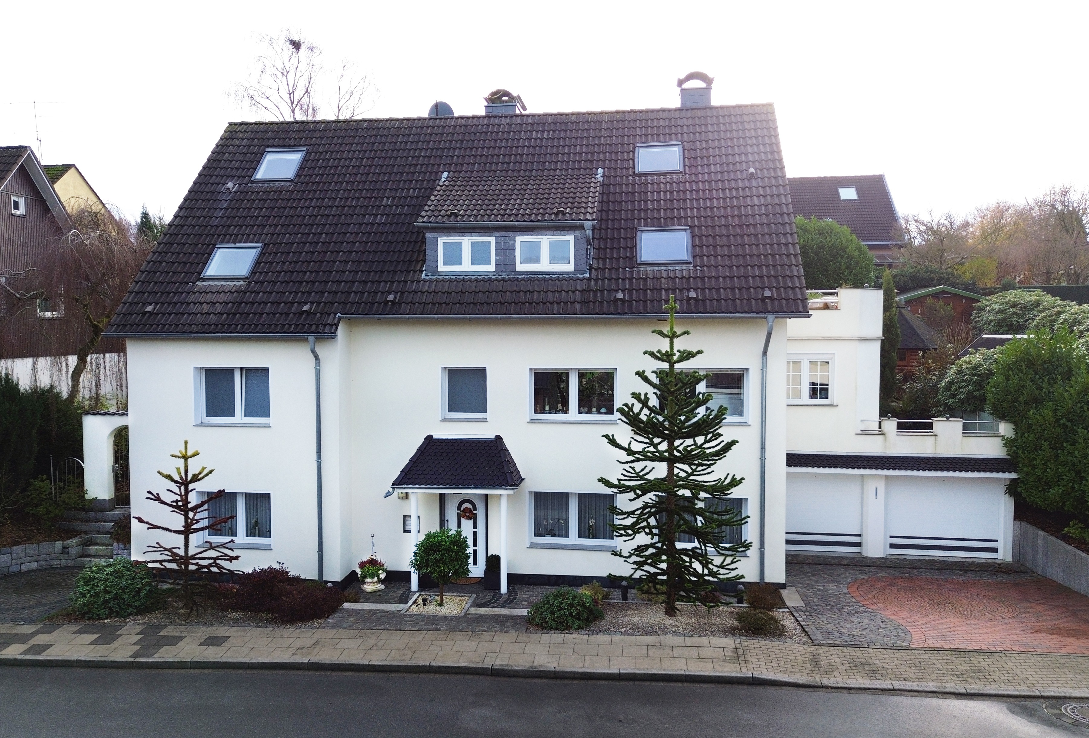 Der Garten, die große überdachte Terrasse und der Balkon laden zum Entspannen ein. Zwei Garagen bieten Platz für Ihre Fahrzeuge.