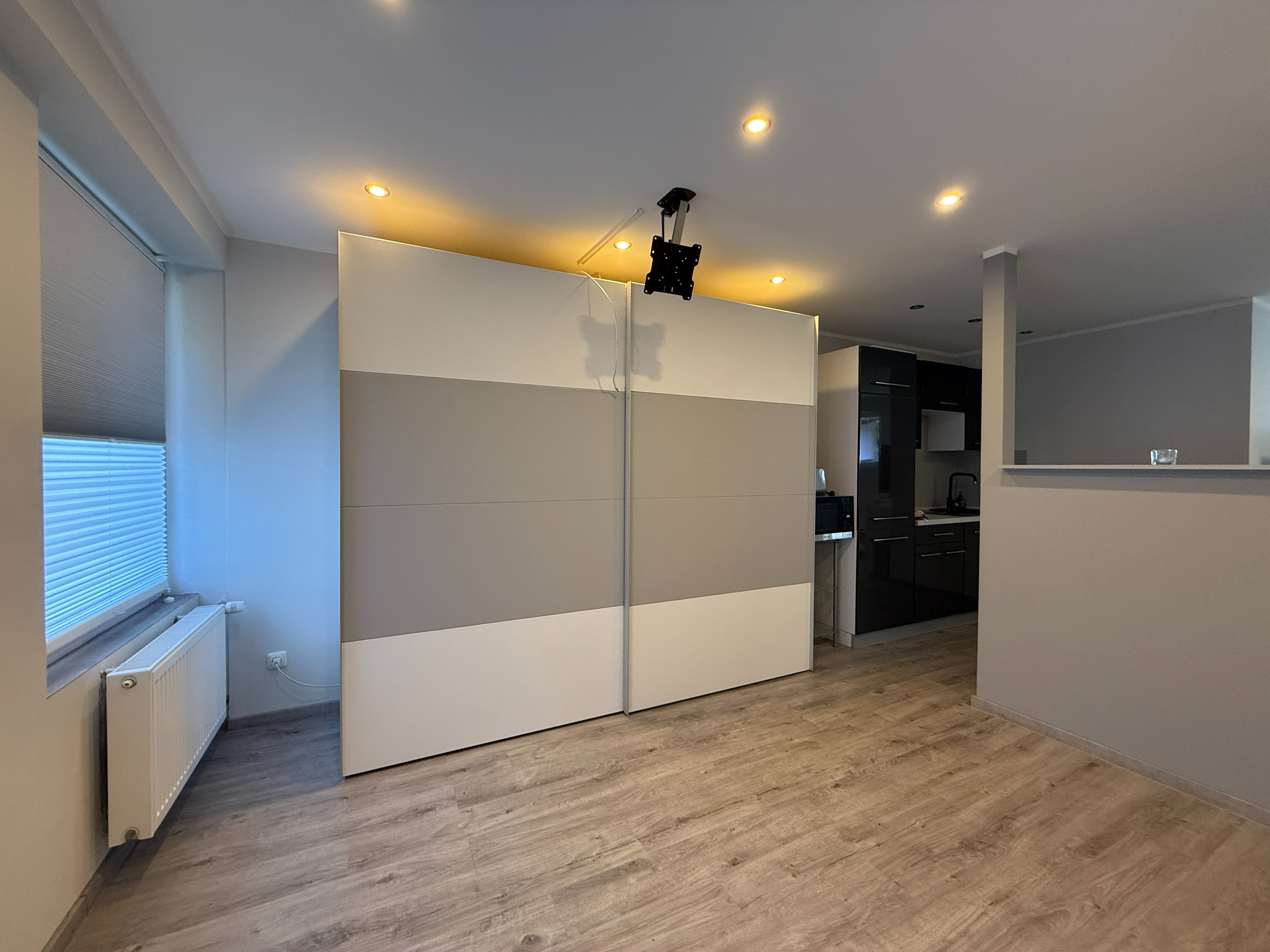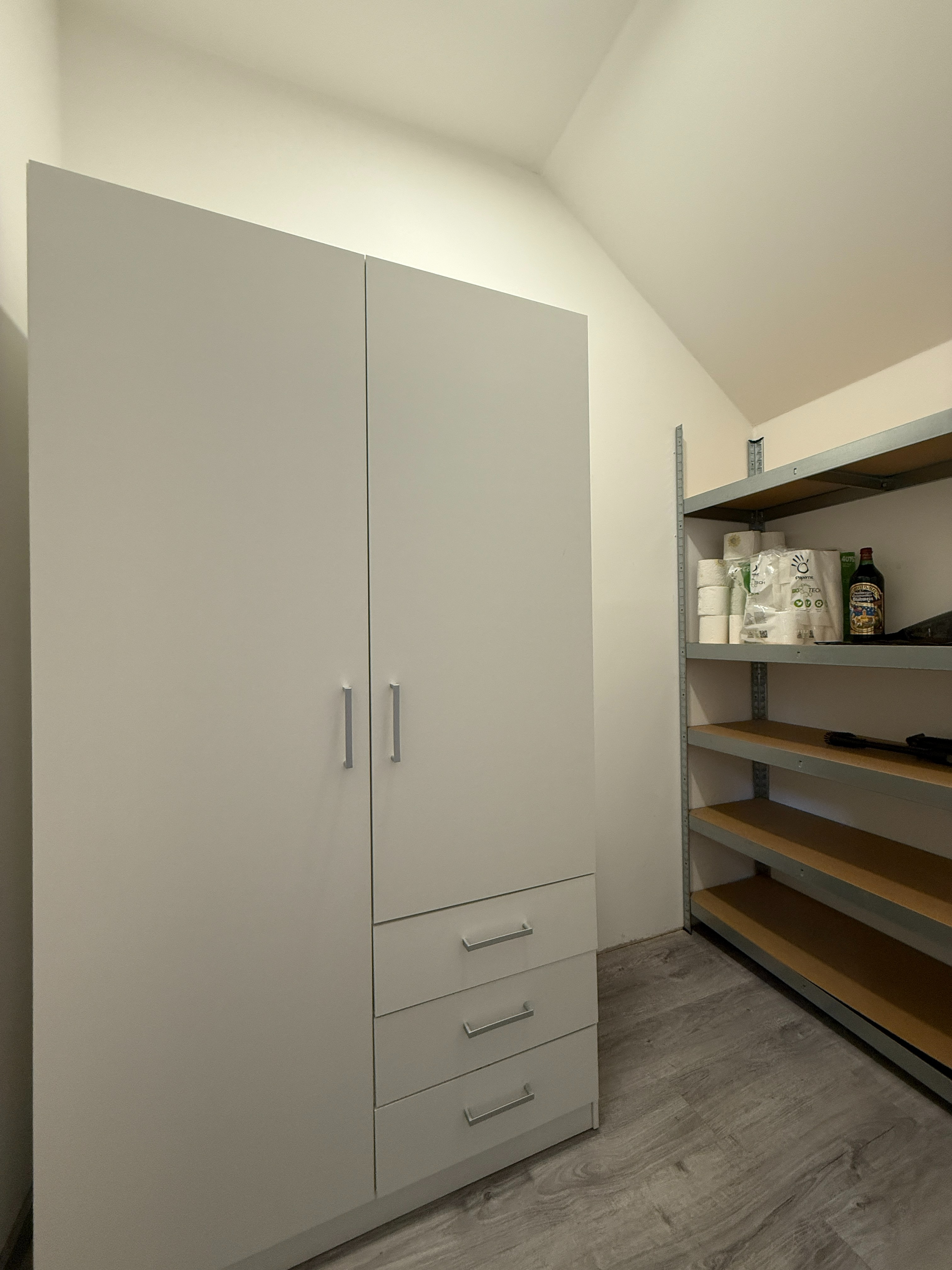 Schlafbereich mit großem Kleiderschrank, Bett und kleinem Regal (Nachttisch)