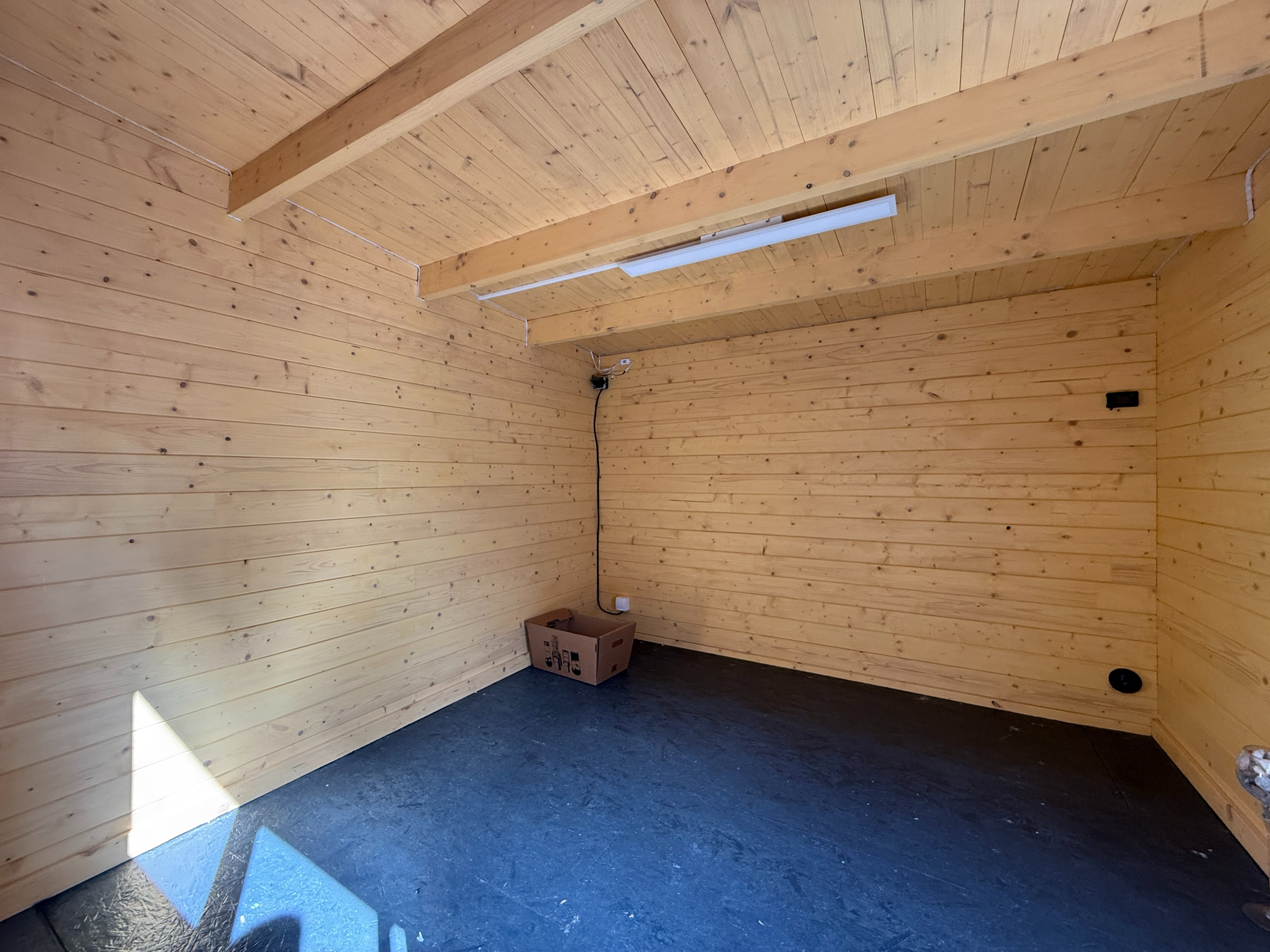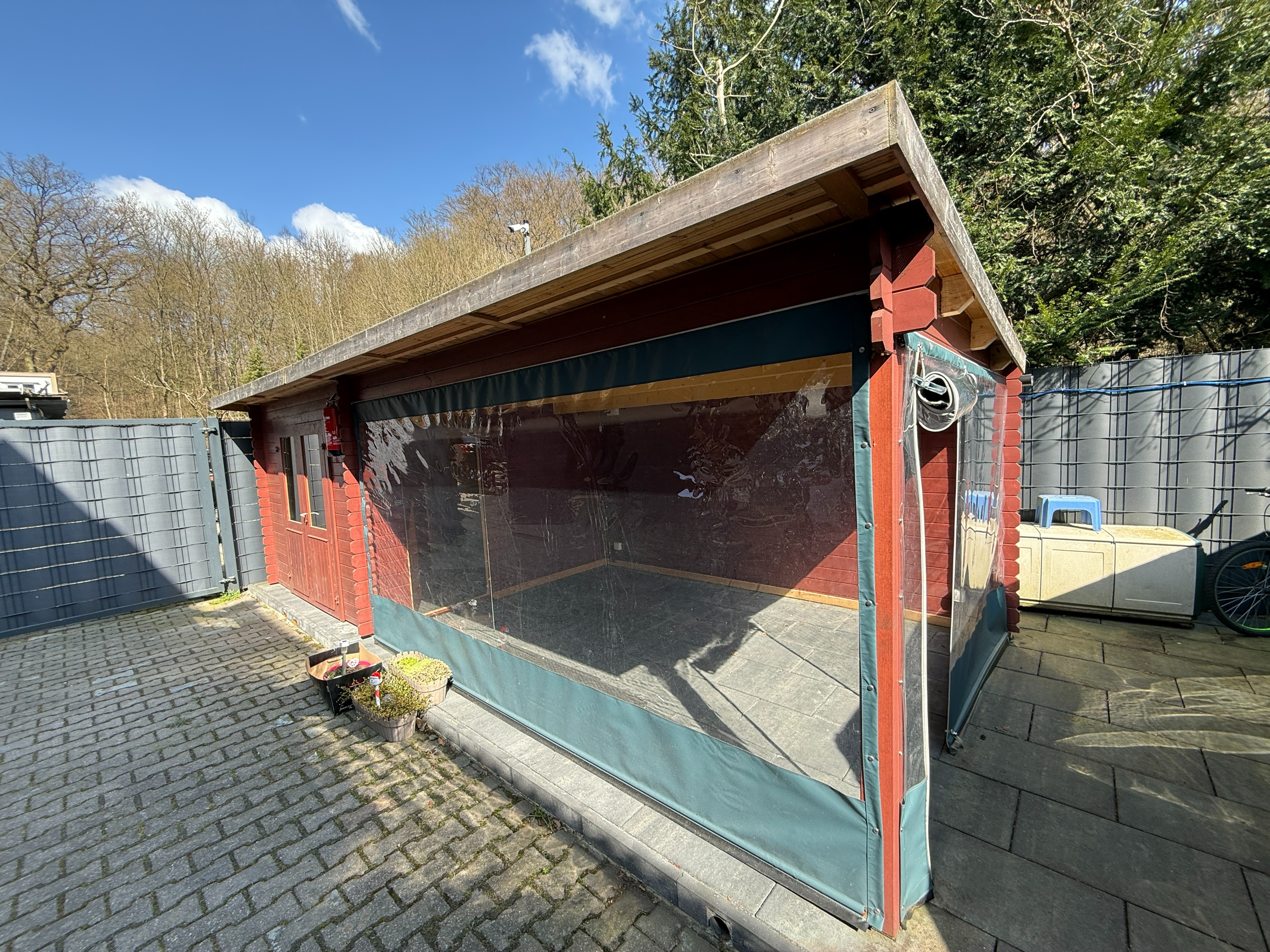 Holz-Gartenhaus ca. 21m² mit überdachter Terrasse und Stromversorgung
