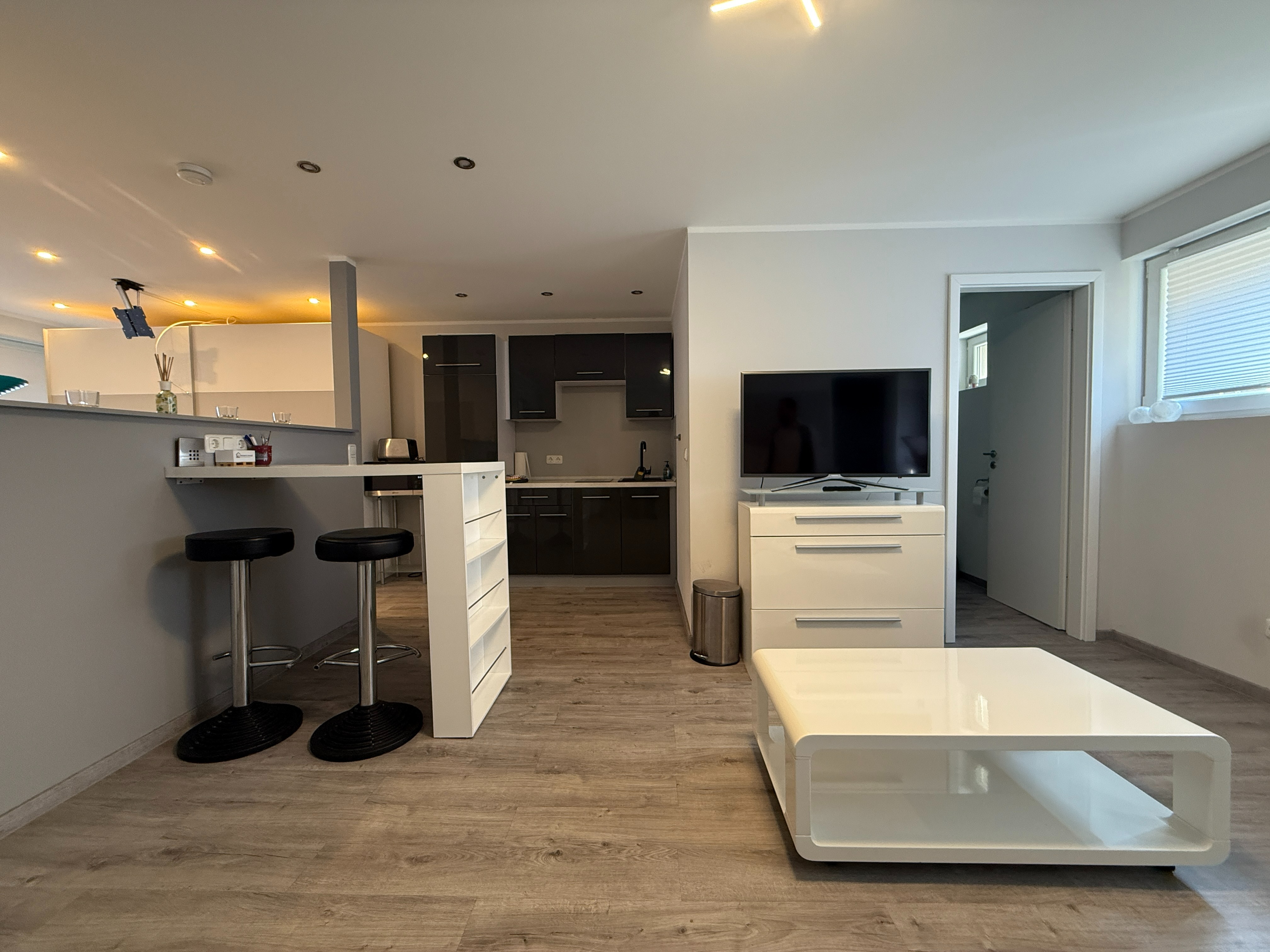 Das Wohnhaus befindet sich in einer ruhigen Sackgasse direkt am Wald. Das gemütliche Apartment im Erdgeschoss besteht aus einem großen Raum, dem Badezimmer und einer separaten Abstellkammer. Es ist fast vollständig möbliert. Der großzügige Raum ist durch eine halbhohe Mauer in Wohn-/Küchenbereich und Schlafbereich unterteilt. Die gesamte Wohnung verfügt über Einbaustrahler oder Deckenleuchten. Der Wohnbereich beinhaltet eine Klein-Küche mit allen notwendigen Elektrogeräten, eine Esstheke mit 2 Hockern, 2 Kommoden, eine Couch mit Couchtisch und ein Fernsehgerät. Im Schlafbereich befindet sich ein Bett und ein großer Kleiderschrank. Das funktionale und dennoch ansprechende Bad ist mit einer Dusche ausgestattet. Das gesamte Apartment ist modern und hell eingerichtet.