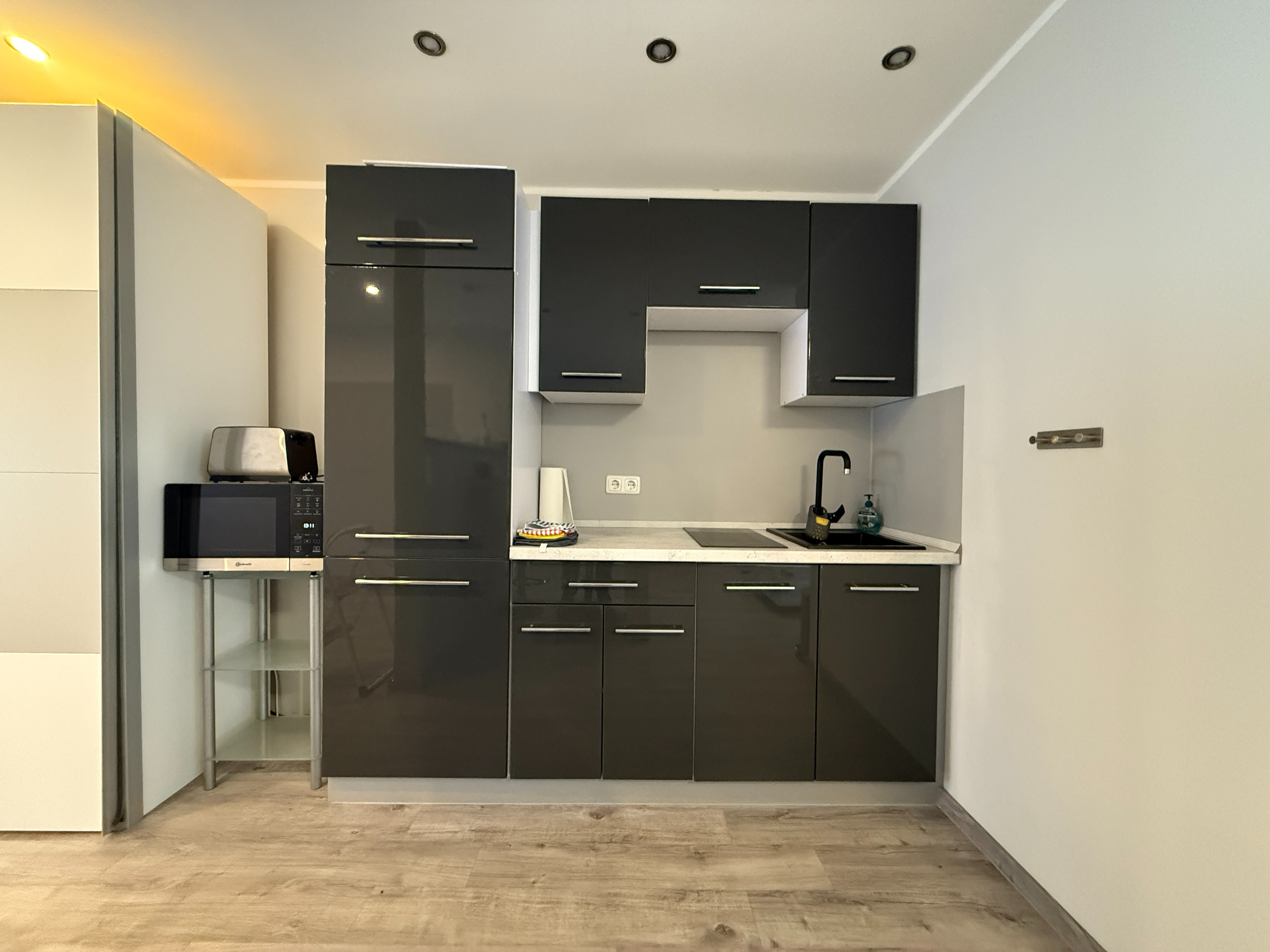 Klein-Küche mit grauer Hochglanz-Oberfläche, Kühlschrank mit Gefrierfach, 2flammigen Induktionsherd, Spüle und Mikrowelle