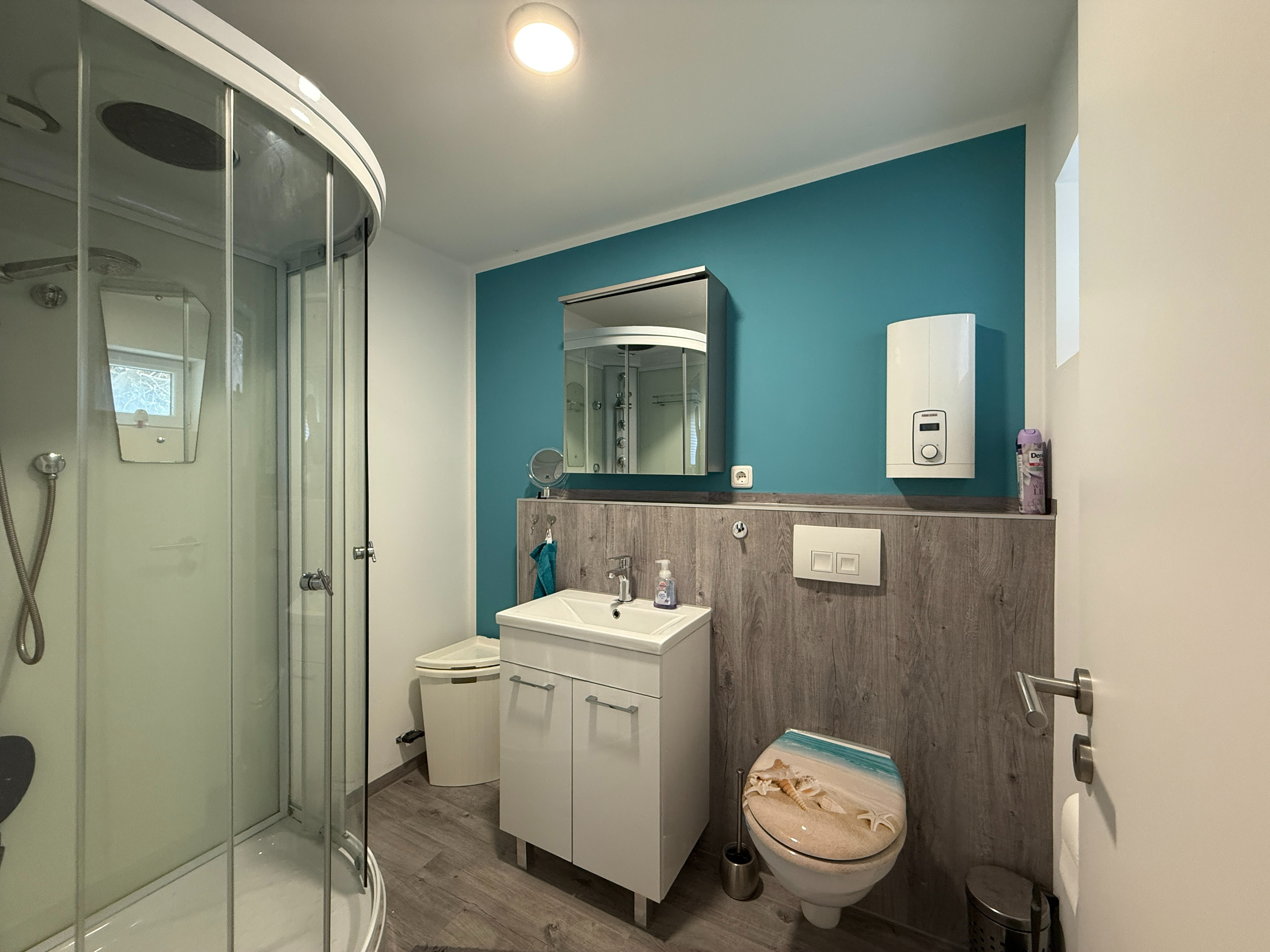 Bad mit Dusche, Spiegelschrank und Waschtisch-Unterschrank
