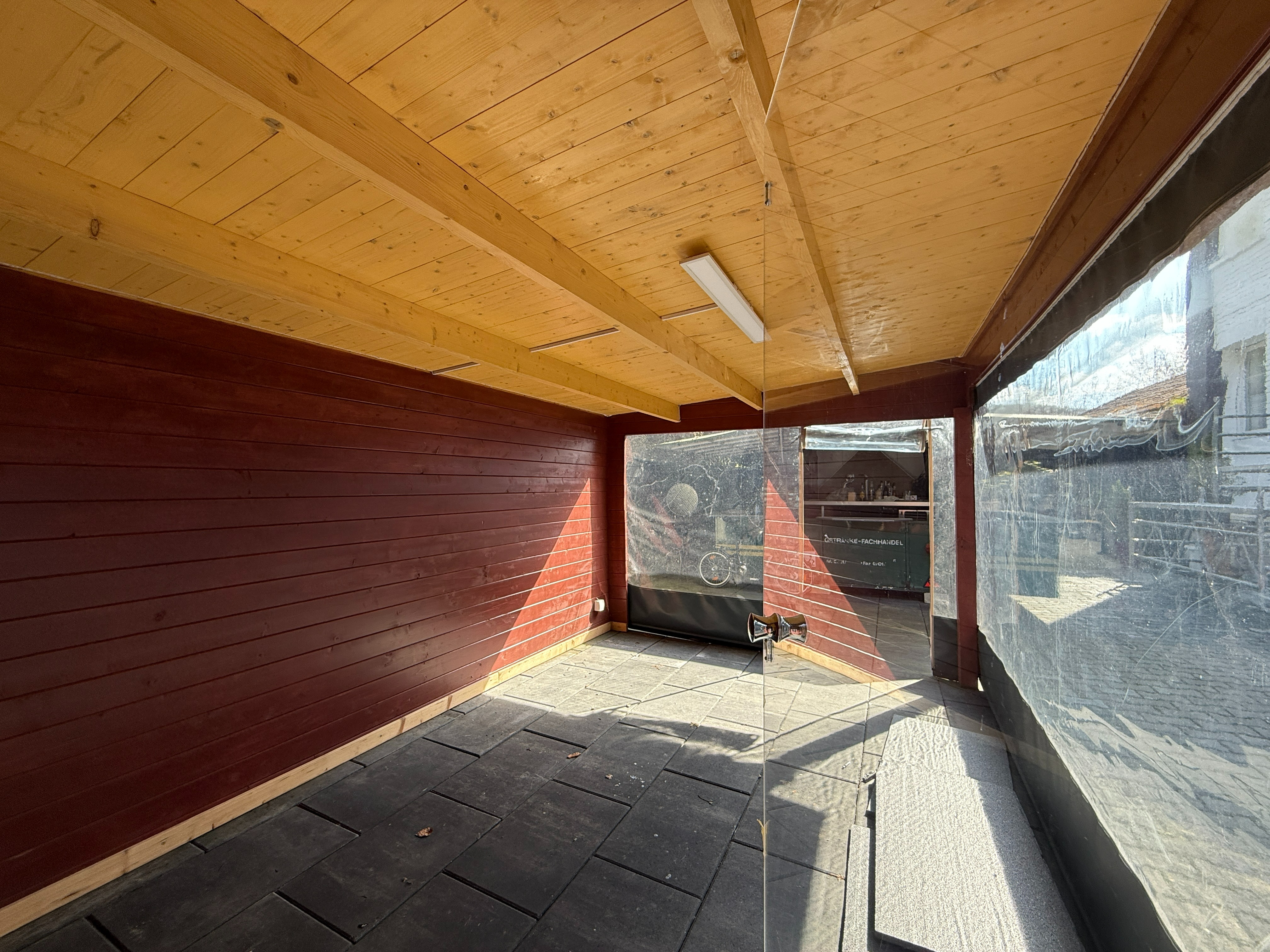 Dem Mieter steht zusätzlich eine Terrasse mit Holzhaus zur Verfügung.